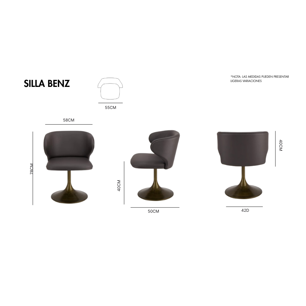 NO PERSONALIZABLE. MATERIALES: PIEL RECICLADA Y ACERO. Esta silla fue inspirada en la sostenibilidad y diseñada con una combinación única de materiales, incluyendo tela, piel reciclada y patas de latón, para ofrecer una apariencia elegante y ecoamigable.