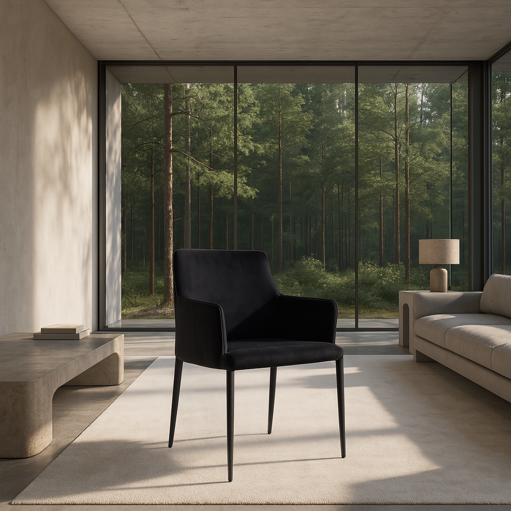 NO PERSONALIZABLE. MATERIALES: PIEL RECICLADA Y TELA . Esta silla fue inspirada en la sostenibilidad y diseñada con una combinación única de materiales, incluyendo tela, piel reciclada y patas de latón, para ofrecer una apariencia elegante y ecoamigable.