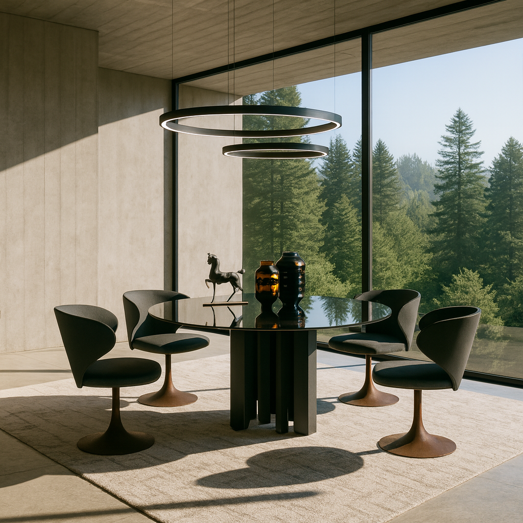 Este comedor redondo ha sido inspirado y diseñado con una base de acero de caídas a diferentes alturas y una cubierta de cristal, creando una apariencia elegante y única que aporta estilo y sofisticación a cualquier hogar.