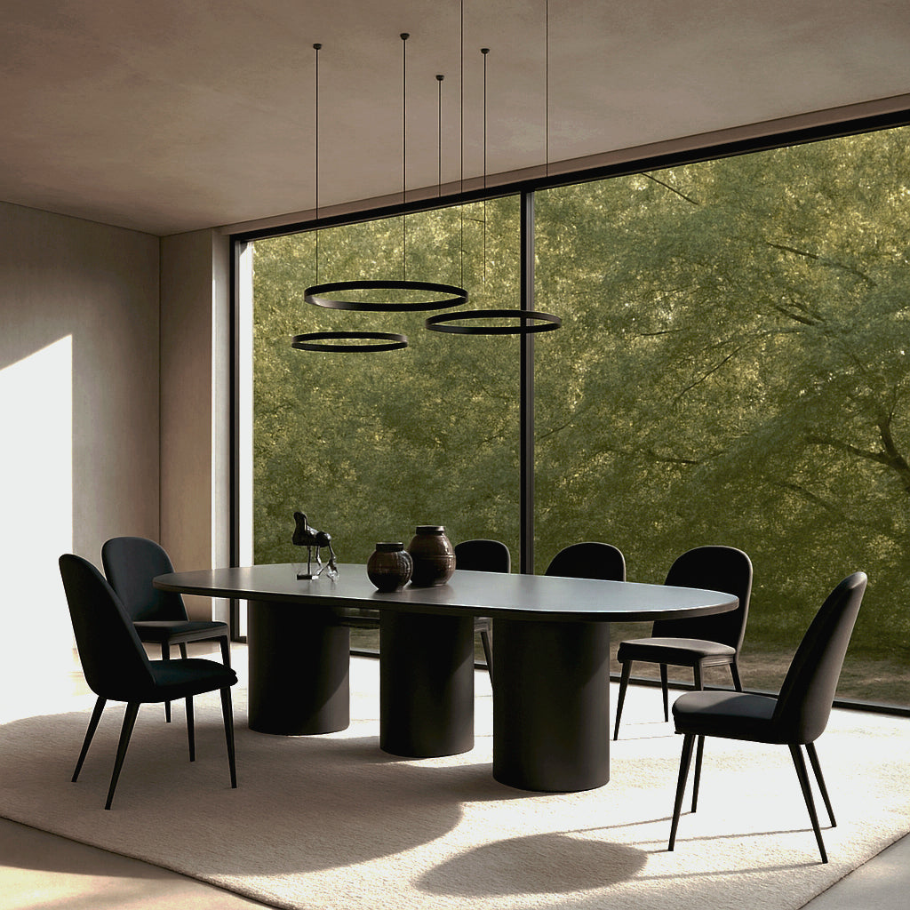 PRODUCTO PERSONALIZABLE Este comedor rectangular ha sido inspirado y diseñado con una base de acero de cilindros, que le da un toque distintivo y moderno, combinado con una cubierta de granito ebony que aporta elegancia y sofisticación. Esta combinación única de materiales y diseño hacen de este comedor una pieza excepcional para cualquier hogar.
